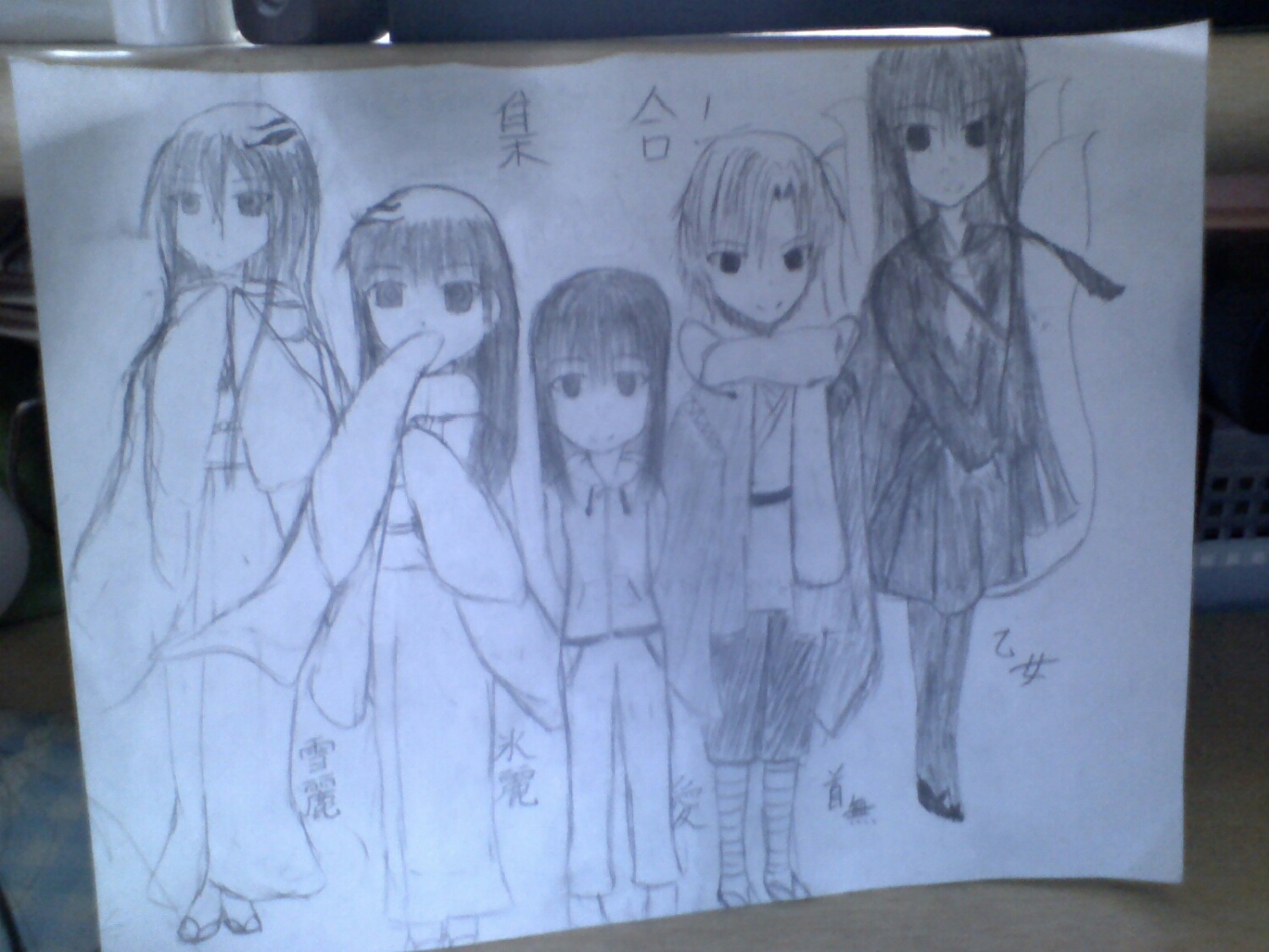 201412/31 集合写真?あ、集合絵か… タルパ 0 全員集合ではないですけど…それは後ほど書いていきたいと思います。左から順に 雪麗 氷麗 私 首無 乙女姉さんです。…乙女姉さんごめん…。上手く書けなかったよ…。ちょっと汚いですけど…しょうがないので、これで。…思ったけど…私、チビだな! [1回]